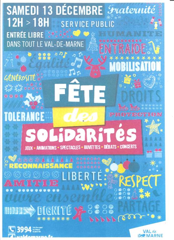 La Fête des Solidarités dans tout le Val de Marne avec des jeux, des animations, des spectacles, buvettes, concert et débats. A Villeneuve le Roi, elle se déroulera au gymnase du Collège Jean Macé le Samedi 13 décembre entre 12h et 18h. Entrée Libre