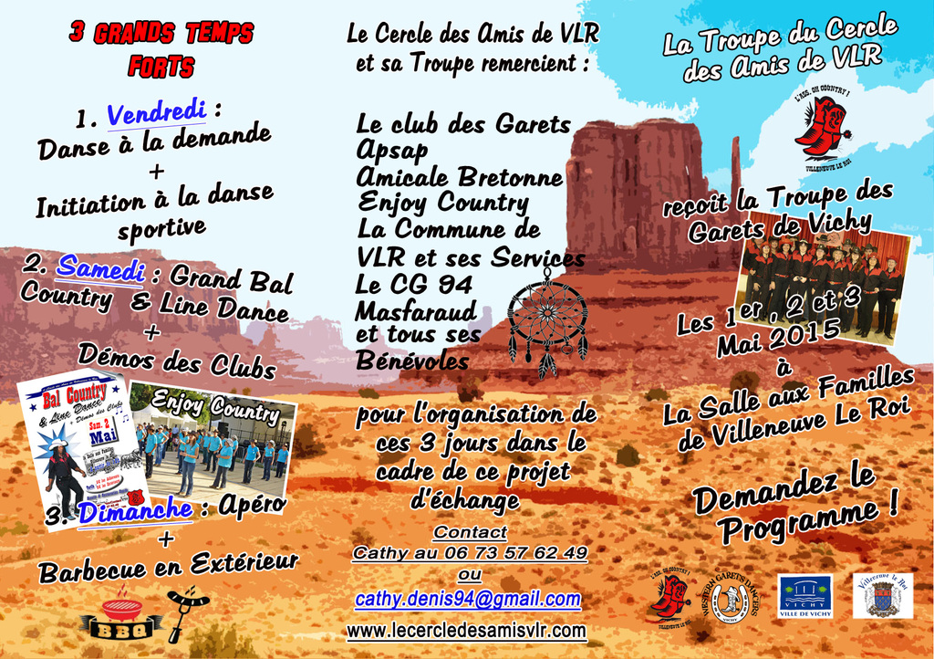 Dans le cadre de son projet d'échange démarré en Septembre 2013, et après s'être déplacé à Vichy en Avril 2014, c'est au tour de la Troupe du Cercle des Amis d'accueillir la Troupe Country des GARETS de Vichy pendant 3 jours, les 1er, 2 et 3 Mai prochain à Villeneuve le Roi.